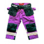 Slitstark och vattenavvisande arbetsbyxa till barn som är lila med svarta detaljer. Två hängande spikfickor med flera fack, som dessutom är undanstoppningsbara. Två fram- och bakfickor. Duratex®-förstärkta knäskyddsfickor med vadderade inläggskuddar. Detaljer så som hammarhankar, tumstock- och pennficka samt sidfickor, varav en med lock och kardborrelås. Två parallella Loxy®-reflexer löper runt vardera benslut så att du kan vara säker på att ditt barn får bästa förutsättning till att synas i mörker. Ställbart bälte som är lätt att justera ingår. Byxans nedre bensöm har dubbelvikt fåll. Genom att släppa sömmen ger det möjlighet till en förlängning när man växer ur dem på längden. Finns i 6 st olika storlekar mellan 90-140.
